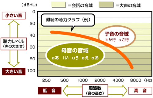 聴力は、40代からすこし低下していきます。一般的に、低下の多くは、右のグラフのように、高音が少しづつ低下していくために子音が聞きづらくなります。そのため言葉が不明瞭になります。